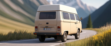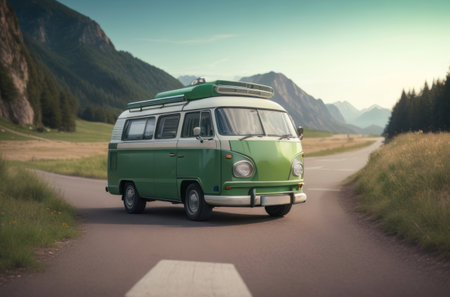 Illustration of a green camper van on a road with beautiful mountain backdrops.generative AI