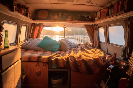 Cozy beach van interior with ocean view at sunrise, showcasing natural wood decor and inviting living space setup. Generative AI