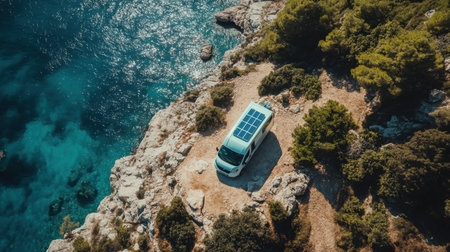 A cozy campervan parked along a stunning coastline, with solar panels soaking up the sun, embodying sustainable travel and adventure