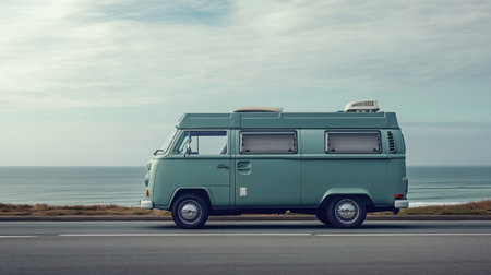 Classic camper van in retro style, featuring a surfboard on the roof, evokes a sense of summer adventure and travel