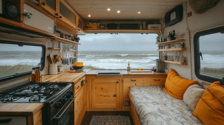 Cozy interior of a van with ocean view during an overcast day, highlighting modern design and comfort by the seaside. Generative AI