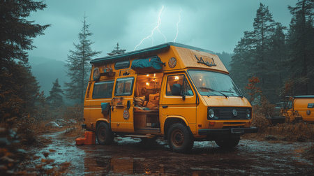 A cozy yellow camper van parked in a forest during a thunderstorm, with striking lightning in the background and evening light. Generative AI