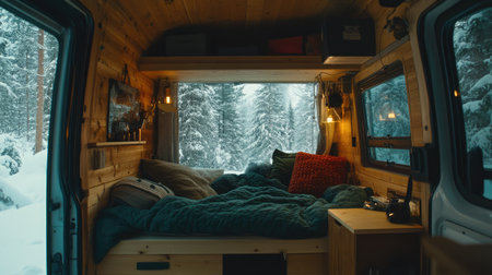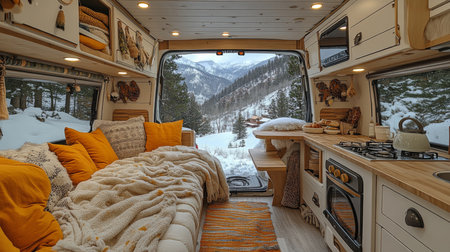 Cozy van interior with warm textiles and winter mountain view in a snowy landscape. Generative AI