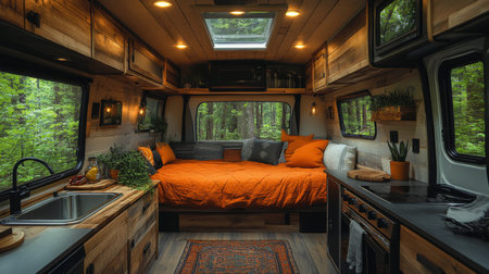 A cozy and rustic camper interior set in a lush forest with warm orange bedding and natural wood accents. Generative AI