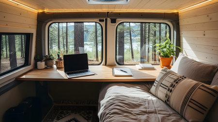 The interior of a camper van converted into a mobile workspace with a laptop on a wooden desk. Large windows offer a serene view of a pine forest, illustrating the freedom of the digital nomad lifestyle.