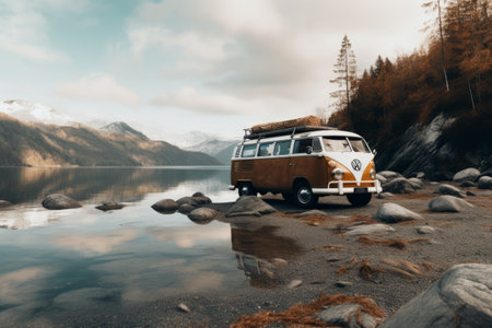 Cozy van interior overlooking a serene lake surrounded by mountains in the early morning hours. Generative AI