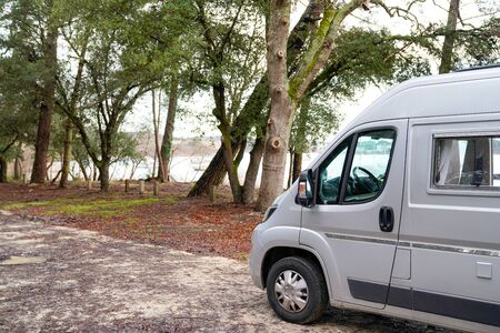 motorhome at lac d'hourtin under the pine trees of the forest in vanlife concept camper van
