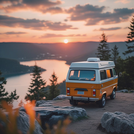 Camper van parked on the roadside near a scenic overlook, reflecting the warm golden light of the setting sun over the mountains