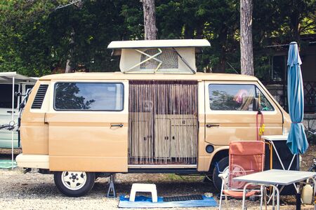 Campervan rv van on coast in Spain. Camping on nature. Holidays and traveling in motor home.
