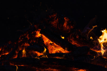 Vivid smoldered firewoods burned in fire close-up. Atmospheric warm background with orange flame of campfire. Unimaginable full frame image of bonfire. Burning logs in beautiful fire. Wonderful flame.