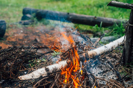 Campfire at the tourist campsite, hiking tourism on weekend vacation, fire flame