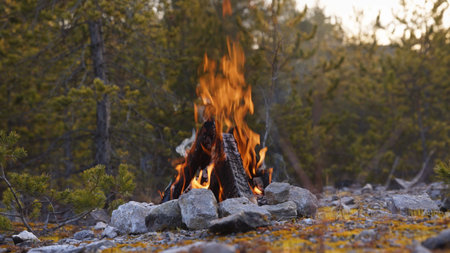 Beautiful Crackling Campfire in a Rocky Landscape among the Pines, Sunrise , Authentic Place