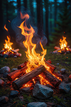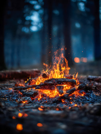 A flickering blaze radiates vibrant orange hues amid shadows of dense woods, casting a cozy glow as twilight deepens into night outdoors.