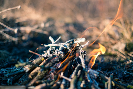 Small flame dying fire, bright red-orange flame. Cozy warm atmosphere by outdoors campfire recreation, burning wood.