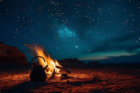 A teapot sits on a fire in the desert. The sky is dark and the stars are shining brightly