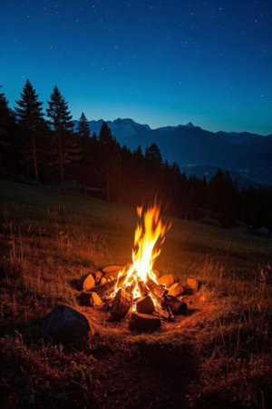 Campfire stories under the stars, shadows dance, tales of old