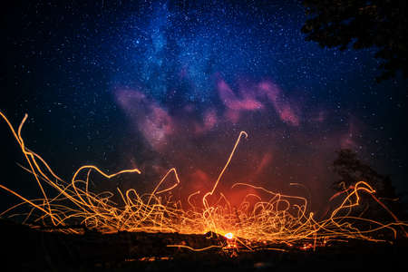 Sparks of summer bonfire at night in nature
