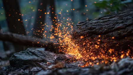 Erupting sparks from a log create a mesmerizing display of light in a serene forest setting. The bokeh effect adds a magical ambiance.