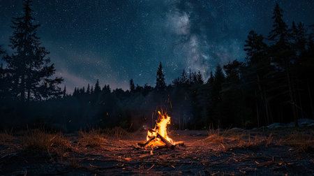 Experience the serene beauty of a campfire illuminated against a starry night sky. Wisps of smoke rise gracefully, enhancing the tranquil atmosphere of nature's wilderness.