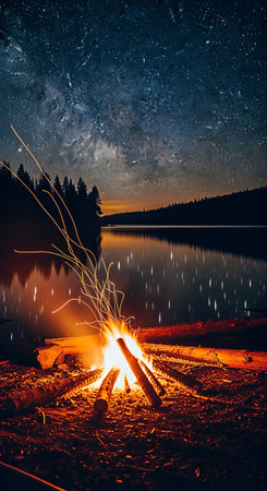 A serene campfire scene, illuminated by stars and the Milky Way, perfect for a memorable outdoor adventure. Generative AI