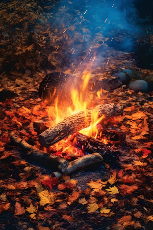 Experience the warmth of a cozy campfire in a serene forest setting, with vibrant flames and glowing embers inviting relaxation and camaraderie.