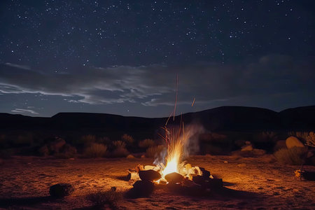 A campfire surrounded by sand dunes under a starry sky in the desert. Generative AI