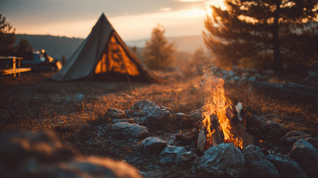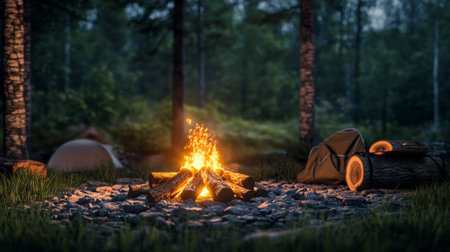 A tranquil campground scene featuring a cozy campfire surrounded by lush greenery. Perfect for conveying warmth, relaxation, and outdoor adventures.