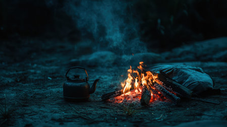 A serene night scene featuring a cozy campfire with a kettle, surrounded by dark wilderness. The glow of the fire creates a calming ambiance, perfect for relaxation and adventure.