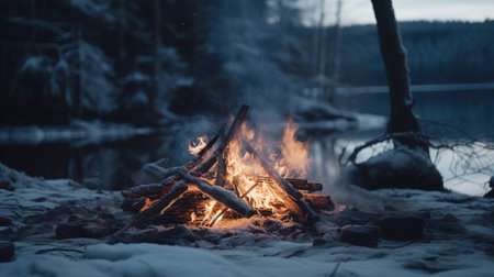 Generative AI, Burning bonfire, beautiful winter landscape, camping outdoor concept in neutral muted colors, tourist camp