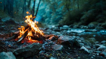Bright flames dance among rocks at a tranquil campsite, offering warmth and light during a cool night.