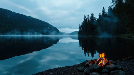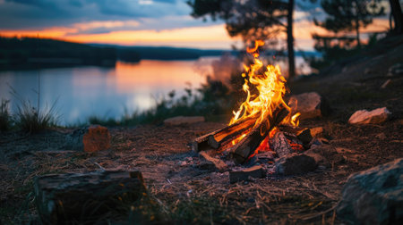A captivating campfire scene at sunset by a tranquil lake. The warm hues of the sky beautifully reflect on the water, enhancing the peaceful atmosphere.