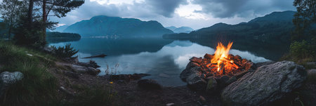 Campfire in the mountains by the lake with forest in the background. Panoramic nature banner at night.