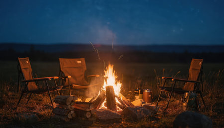 A serene campfire scene, illuminated by stars and the Milky Way, perfect for a memorable outdoor adventure. Generative AI