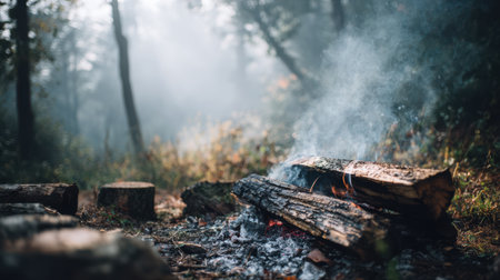Extinguished campfire with faint traces of smoke, blackened logs lying in ash, empty forest background, soft morning atmosphere