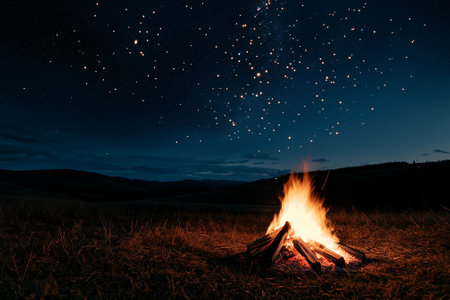 Medium shot of a cozy camp setup with a focused campfire and blurred starry atmosphere in an open night observation field