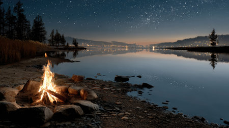 A captivating nighttime scene featuring a glowing campfire on the shoreline, surrounded by stones and reflecting stars on calm water, promoting tranquility.