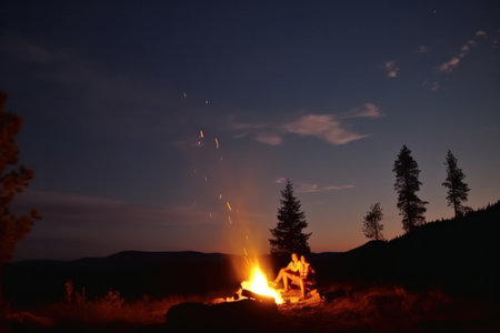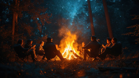 Gathering around a warm campfire, sparks fly into the night air while friends enjoy stories and laughter amidst the serene outdoor setting.