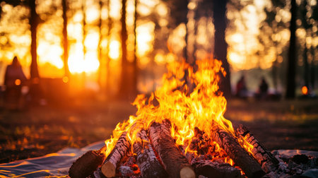 The warm glow of a campfire illuminates logs as the sun sets behind tall trees, casting a serene ambiance in the peaceful forest. People gather in the background, enjoying the evening.