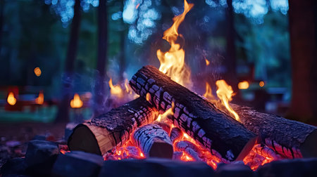 Experience the warmth of a cozy campfire in a serene forest setting, with vibrant flames and glowing embers inviting relaxation and camaraderie.