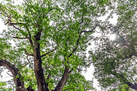 An upward perspective captures a large tree with dense, green leaves reaching towards the sky. The image showcases a textured tree trunk and branches that fill the frame. This natural composition, with overhead lighting, provides a visually appealing look suitable for various commercial or editorial applications.