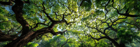 Experience a serene view of a lush green canopy, where sunlight beautifully filters through the vibrant leaves and intertwining branches of majestic trees.