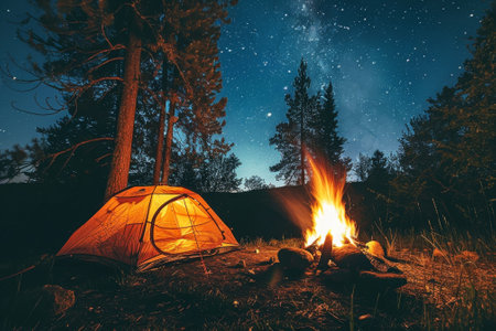 Cozy illuminated tents glow under a starry night sky, promising adventure and escape in nature's embrace