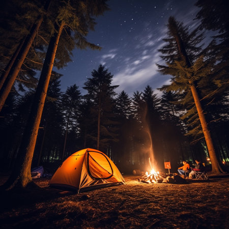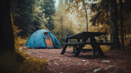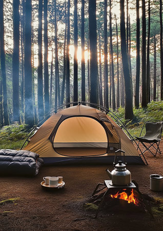 An outdoor camping scene showcases a tent set up in a dense forest. Warm tones of the tent and fire contrast with the cool greens of the trees. The image captures a sense of tranquility with soft lighting and hints of smoke. Suitable for illustrating travel, adventure, or leisure themes.