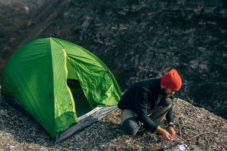 View from the tent. Man sitting near tourist tent during outdoor recreation