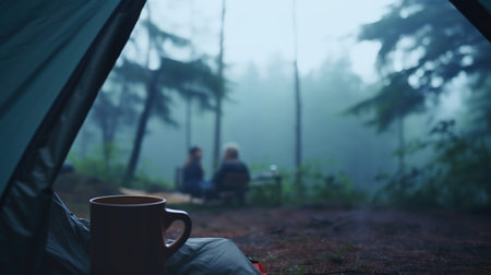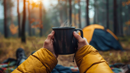 Hands cradle a warm cup, offering comfort amidst a blurred background of colorful tourist tents in a serene forest setting during a misty day.