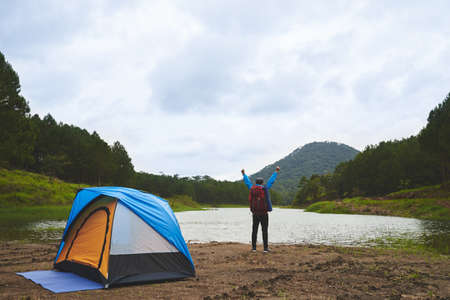 Man relaxing in camping tent at lake shore. Travel, adventure, wanderlust concept