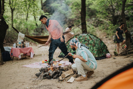 Group of friends sets up campsite at dusk, highlighting adventure and camaraderie of camping.
