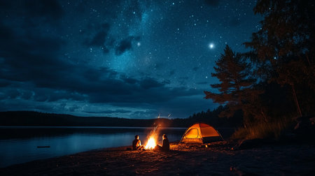 A person is sitting in a tent by a lake at night. The sky is filled with stars and the moon is visible. The scene is peaceful and serene