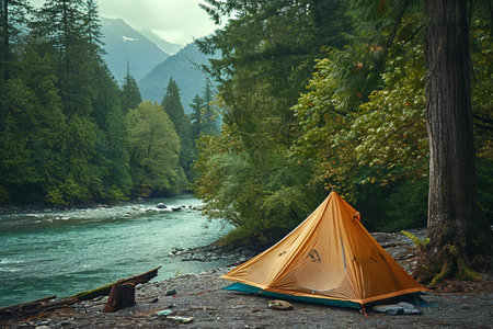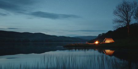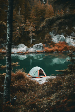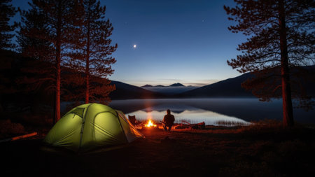 A lone tent pitched by a calm lake at sunrise AI generated illustration