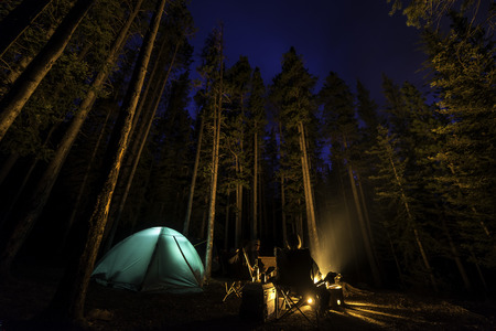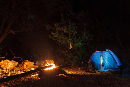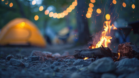 A blue and yellow tent is set up next to a fire pit. The scene is peaceful and serene, with the fire providing warmth and light. The campsite is surrounded by trees